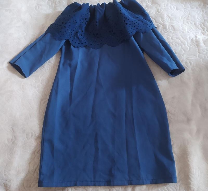 Сукня синього кольору з ажурним комірем на резинці, можна носити як з відкритими плечима, так і закритими, стан - ідеальний. Розмір - 42. Одягала лише декілька разів.
