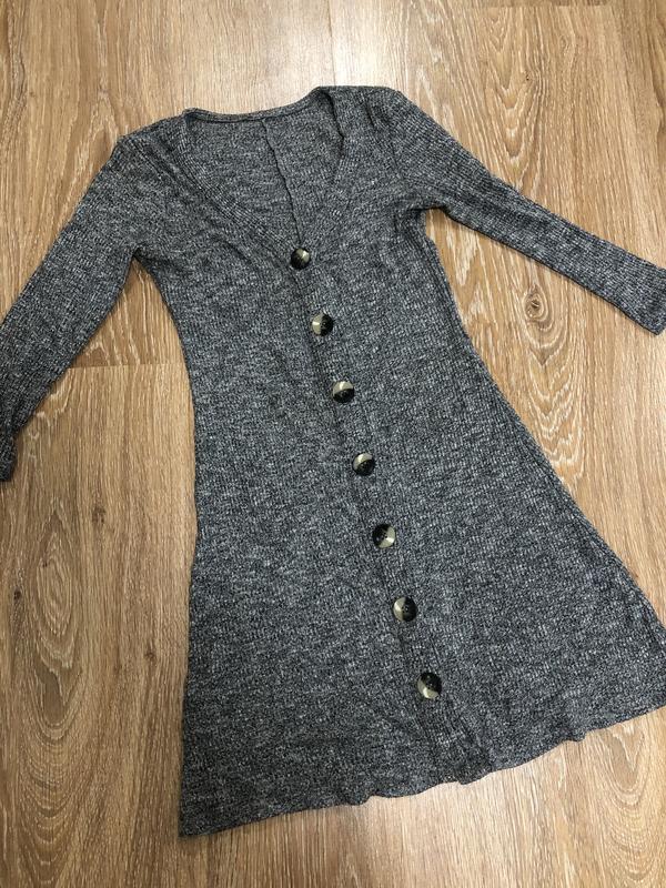 Сіра тепленька сукня в рубчик на ґудзиках по всій довжині. V-виріз гарно підкреслює бюст. Стан відмінний. Бирка відсутня, за фактом на розмір С. Заміри: від пахви до пахви близько 35 см, талія близько 33 см, довжина близько 80 см. Матеріал тягнеться.