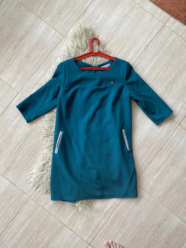 Сукня зеленого кольору, камера просто не передає правильний колір! В дуже гарному стані! Одягалася буквально 3 рази! Один недолік - це на плечах катишки невеличкі, а так все в ідеалі! Кармани оздоблені сріблястими окантовками із екошкіри!