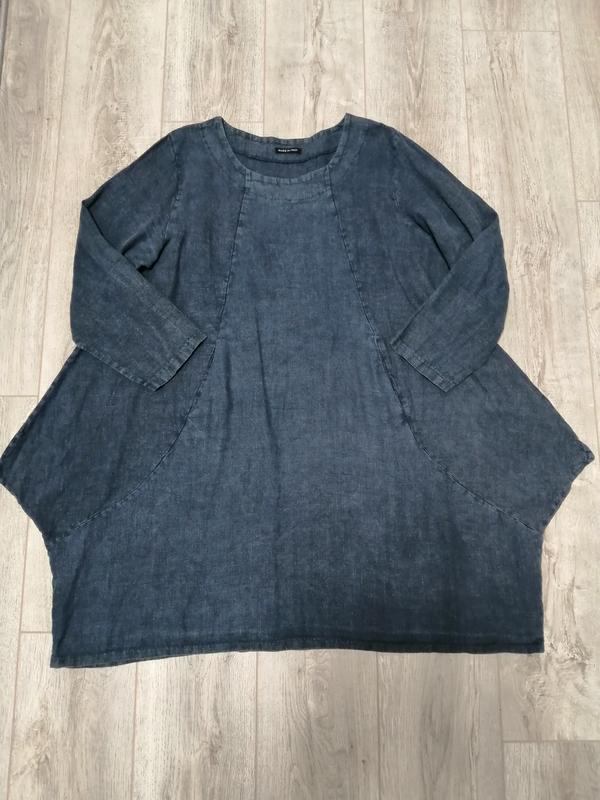 Жіноча міні сукня з 100% льна, темно синього кольору. Оригінального крою в стилі бохо. Дуже приємна до тіла, не тягнеться, дихаючa. З переді дві кишені в рельефних швах, на рівні талії. Довжина - 96см.ПОГ-63.Довжина рукава-56,ширина рукава-21см.