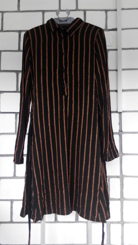 Чорне плаття в світло коричневу полоску з золотистою ниткою Сукня розщирена до низу, за допомогою вкладок. Тканина легка, не парка. Не тягнеться. В плечах 37 см ПОГ 45 см, ПОТ 45 см, ПОБ 64 см, ПОН 94 см ДР 62 см, рукав можна вкорочувати довжина сукні 94 см Є завязки на талії, пришиті на бокових швах Без нюансів