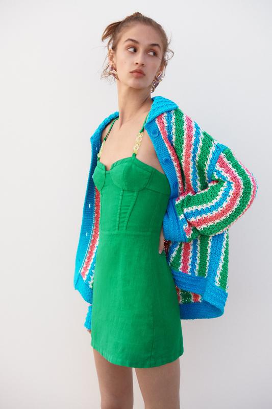 Міні сукня з суміші льону та бавовни Тонкі брителі з пластиковими ланцюжками, застібка позаду Зелений | 3429/570 53% льон · 47% бавовна XS по бірці Довжина згори бритеті 75 Довжина без брителей 59 Пог 39( + обʼєм чашкок) Пот 32 Пос 43 *Є крихітний ньюанс на застібці(фарба)