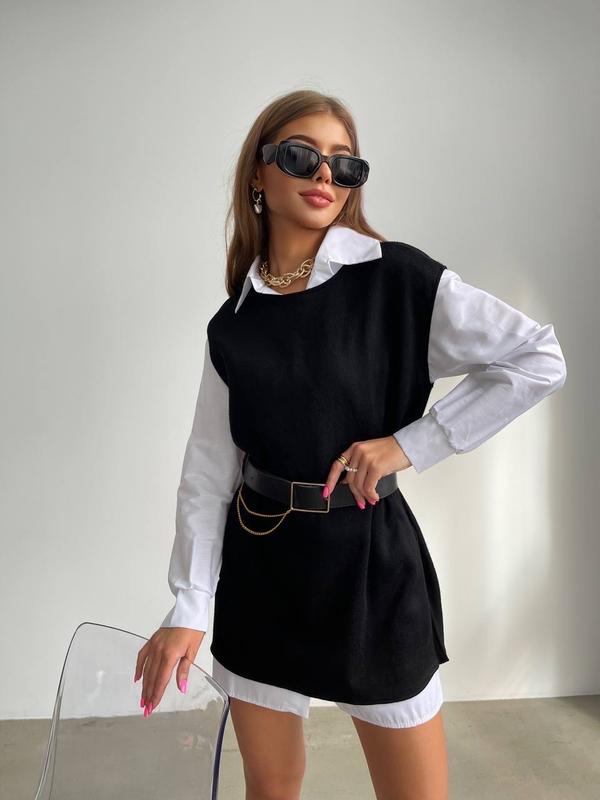 #Комплект Артикул: 856-286 Цвет: белый с черным Размеры: универсал 42-46 Материал: турецкий коттон / двухсторонняя Ангора Рубашка+жилетка с ремнём Фото Реал Заказать 💌