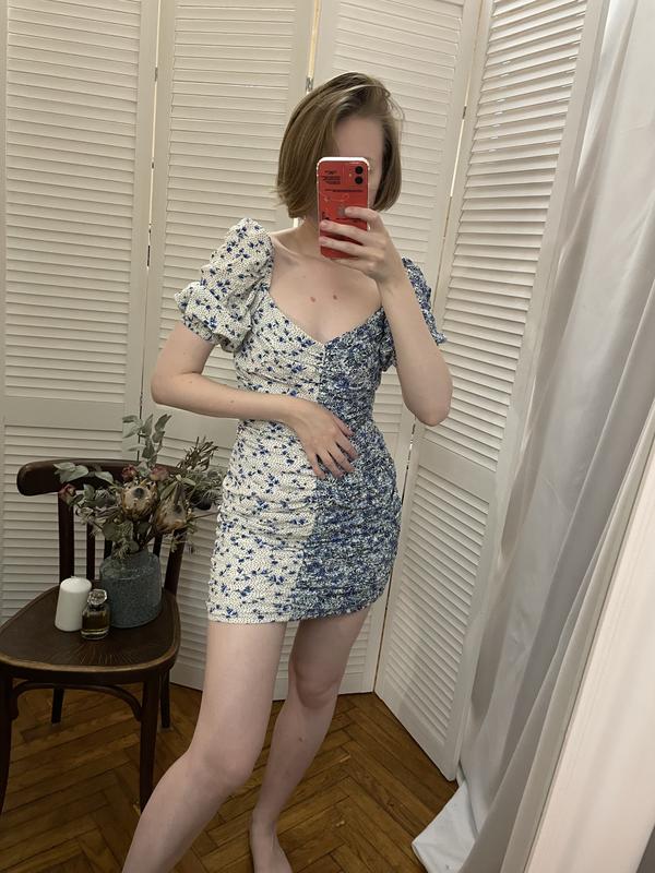 Сукня з квітковим принтом та цікавим дизайном. Матеріал бавовна, підкладка - візкоза. Заміри: півоб’єм грудей - 37 см, талії - 36 см, стегон - 45 см, довжина - 56 см. Трохи тянеться