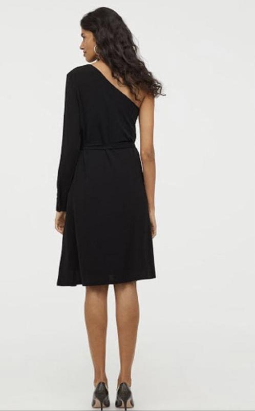 Платье с открытым плечом длиной до колена из мягко струящегося трикотажа. Один длинный рукав с манжетом на пуговичках обтянутых тканью, на талии съемный пояс, юбка клеш. На подкладке. Размер s