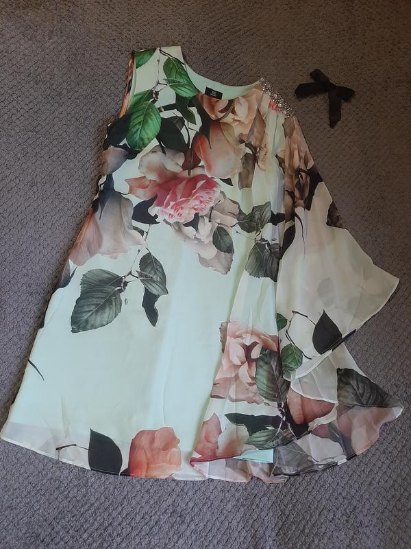 Оригинальное платье в цветочный принт, имеет шифоновый рукав с одной стороны. Подкладка плотная, имеет эффект бандажа. На плече вышивка из блестящих камешков и бисера. Очень красивый праздничный вариант одежды! Размер 12 За дополнительными вопросами и замерами убедитесь в сообщения. 066