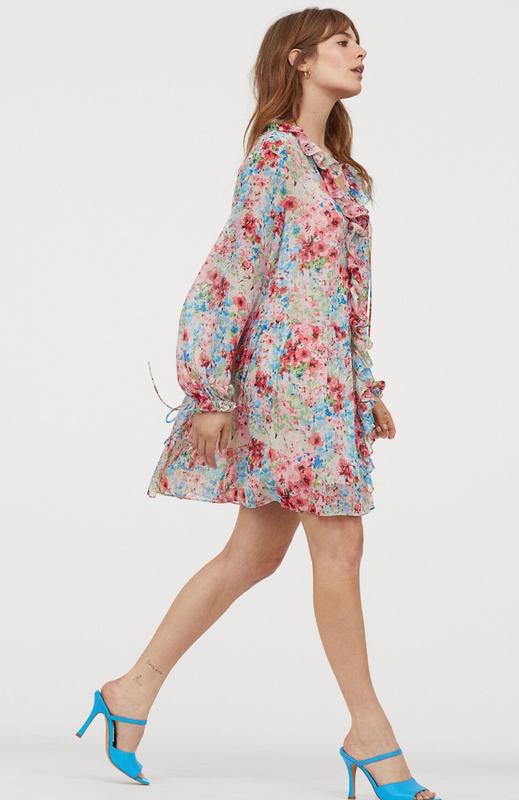 Шифонова міні-сукня вільного крою, з рюшами та зав’язками. Красивий квітковий прінт. Є підклад. Розмір xs, але також підійде на s.
