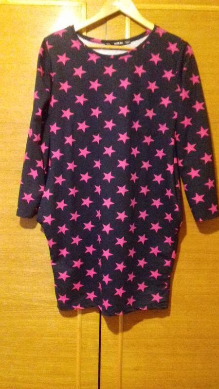Супер плаття в зірочки. По боках кармани. Тканина плотна, тепла, трохи тягнетья. До ниу завужене. Розмір44-46