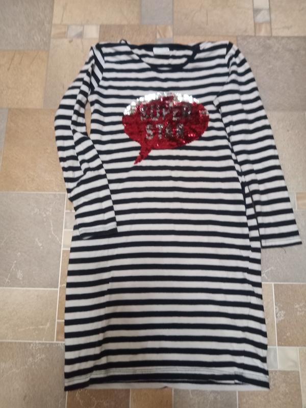 Платье/туника в сине-белую полосочку с пайетками, которые переворачиваются, с карманами, на рост 140
