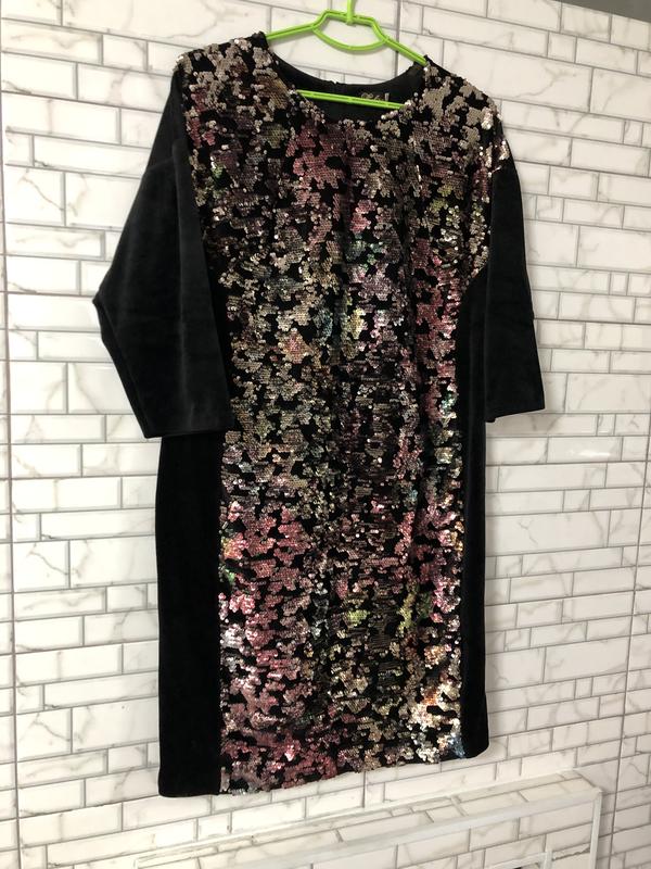 Велюрове плаття Спереду паєтки Розмір 54 (укр) На спинці блискавка Довжина 102 Рукав від горловини 60 Плечі спущені Біцепс 20 Пог 58/60 Поб 60/62
