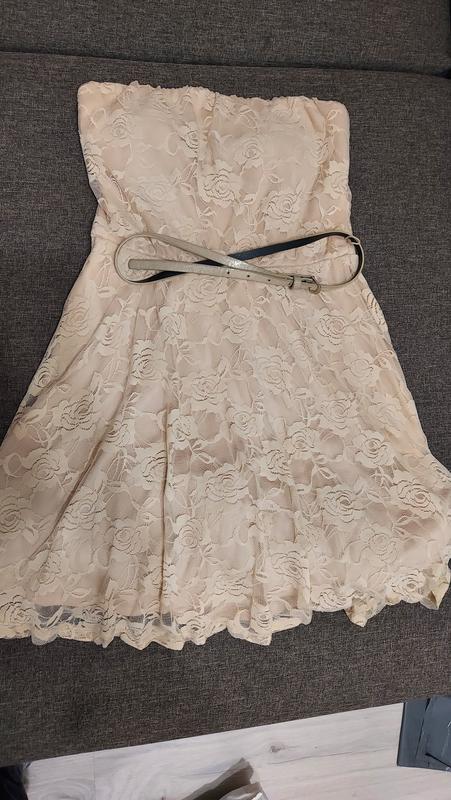 Вечірня/коктейльна сукня бежевого кольору. Мереживна. Топ із чашечками. Спідниця-кльош від талії. До сукні також йде пояс. Спідниця тришарова: мереживо, тканина та під'юбник для об'єму. Стан сукні — як нова. Дуже гарний колір. Розмір: S, M.