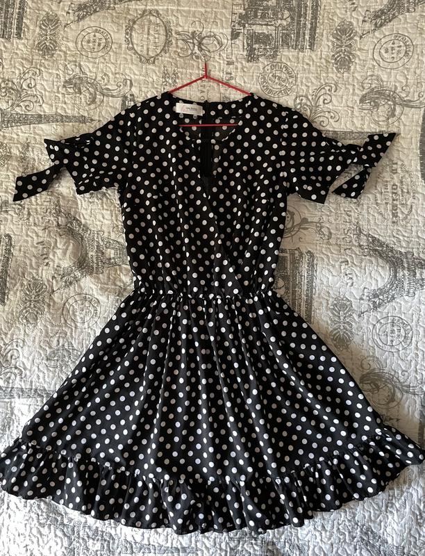 Дуже круте та миле плаття. Одягнула декілька разів, стан ідеальний. Принт — завжди актуальний горох Длинна 90 Талия резинка ПО — 30 Плечи 36 см Рукав 17 см Грудь ПО — 44 см