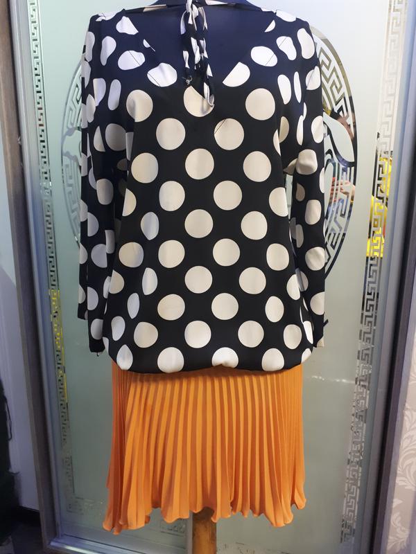 Платье очень моднвй фасон низ плисе перёд короче сзади длинее, при ходьбе очень красиво играет , верх веобразный выкот. Очень нарядное и стильное. Размер М. Все вопросы по СМС пишите отвечу.