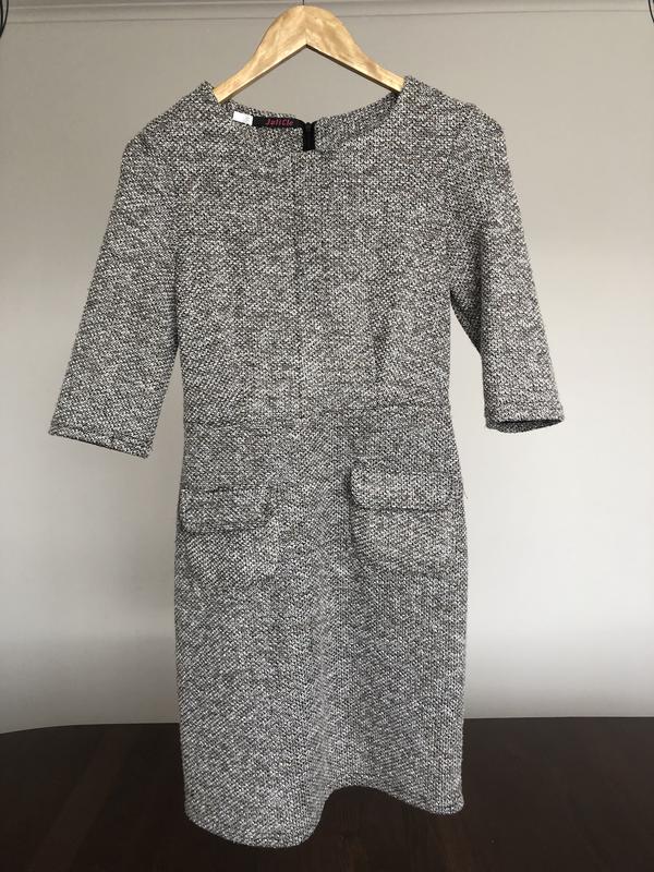 Дуже зручна жіноча сукня. Може бути корисною в осінньому гардеробі. Практичний колір. Довжина четвертного рукава-37см,довжина спідниці від пояса-50см, загальна довжина виробу-90см. Потайний замок на спині. Попереду на спідниці є дві кишені.