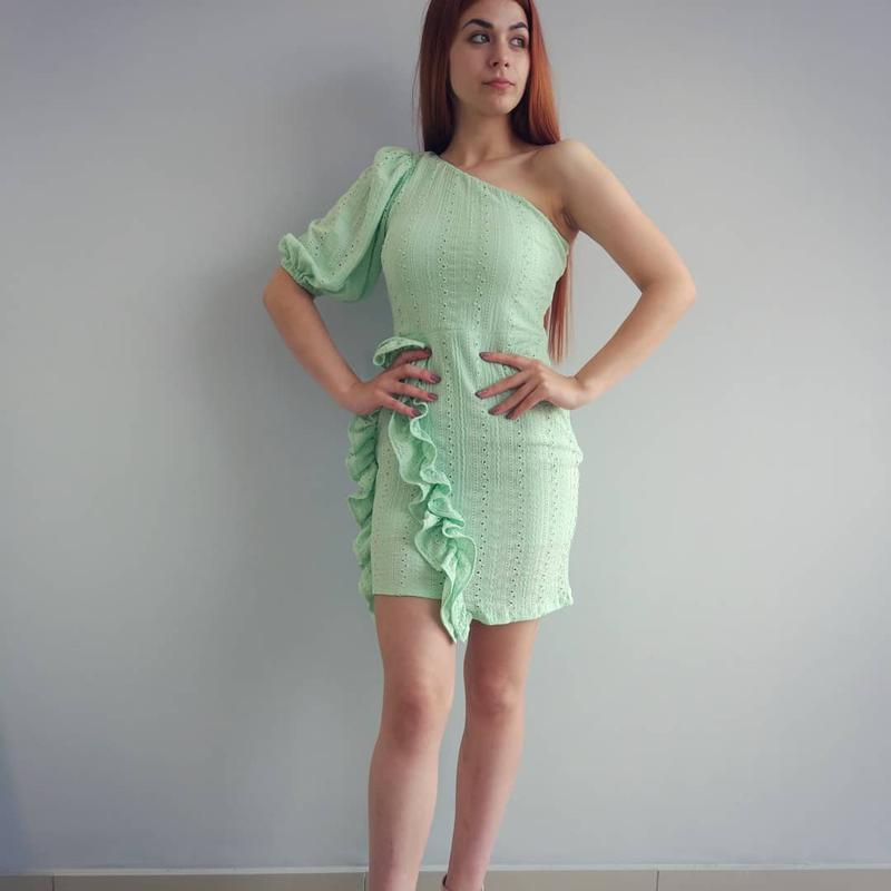 Платье мини приталенное мятного цвета на одно плечо. Юбка украшена воланами на подкладке. Размер: XS, S, M, L. Дополнительные замеры в привод.