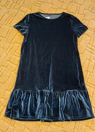 очень красивый глубокий серо-синий цвет ткань велюр размер М/Л длина 90см,грудь 95-105см А силуэт, бедра 100-105см рукавчик 17см