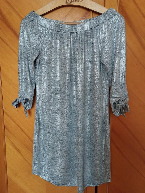 Красивое серебристое платье из синтетической струящейся ткани,не колется. Плечи спущены,рукав 3/4. Выше колена, низ полукругом спереди и сзади. Одето один раз на торжество.