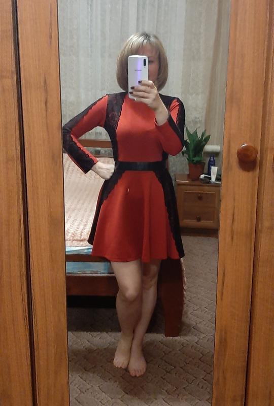 Нарядна сукня червоного кольору в чорну маленьку крапинку,оздоблена мереживом.На талії стрічка із екошкіри.Одягнута 2 рази,в ідеальному стані.Довжина 80 см, Пог-45,Пот-35.Тканина ще тягнеться.На фото зріст 165 см.