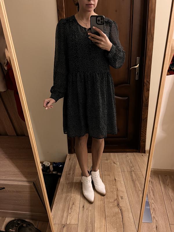З низі сукня на бретелях, зверху прозора накидка в горох, стан чудовий, вдягала 1-2 рази.