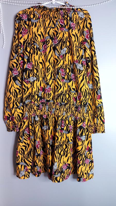 Красива сукня , талія на резинці, комір стійка ззаду на 2 ґудзиках Плечі 34см О. Г. 82см Талія по резинці 66 см Довжина рукава 60 см Довжина сукні до резинки 44 см Довжина спіднички від резинки 32 см