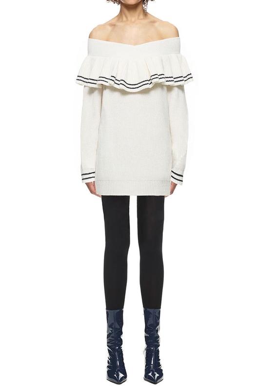 трикотажна коротка сукня молочного кольору від Self portrait . Можна носити зі спущеними плечима ., чи як кофту з брюками та легінсами . На останніх фото я.