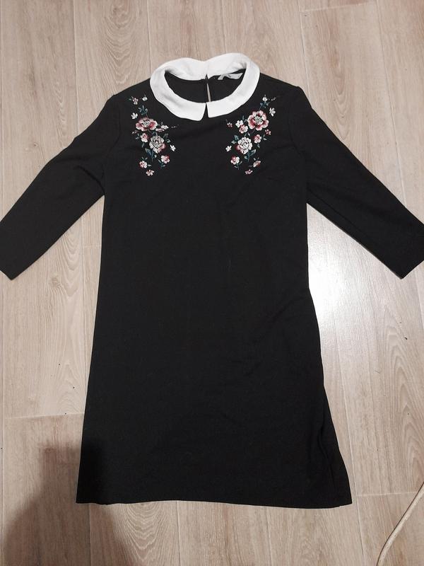 Дуже крута та елегантна чорна сукня з вишивкою, білим воротничком та половинним рукавом. Недоліків немає, вільний силует.