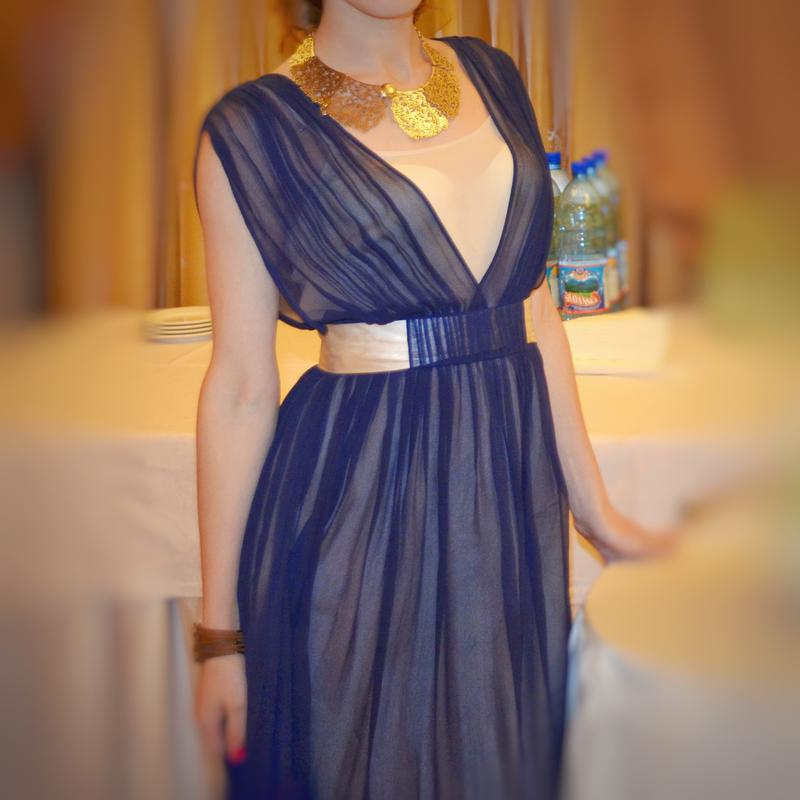 Верх - легка темно-синя тканина. Низ - Бежевий Вшитий атласний пояс на талії Довжина до коліна на зріст 161 см