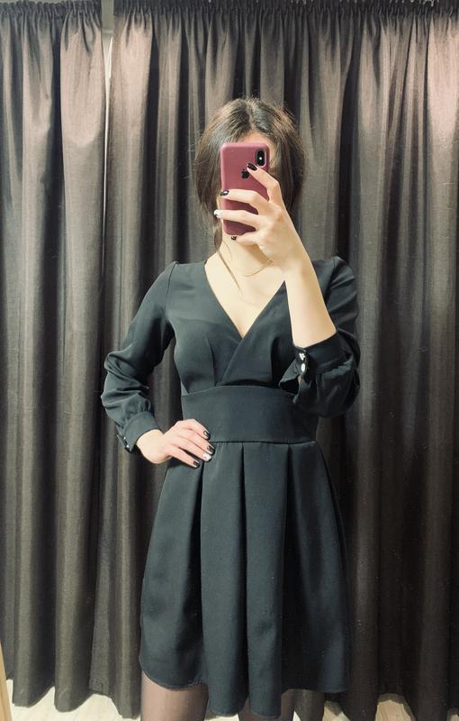 Чорна сукня зі спідницею в складочки, рукави застібаються на гудзики. Сукня збоку застібається на блискавку. Розмір приблизно М(уточнюйте виміри).