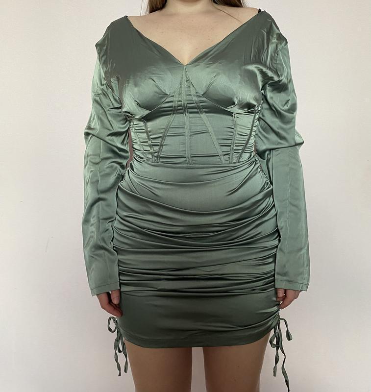 Гарне атласну сукню, ззаду на блискавці , спереду імітація корсета , гарно сидить по фігурі , трохи тягнеться , довжина регулюється стяжками , можна зробити , як короткий, так і довгий плаття , дуже гарно сидить на попі , надає їй форму , повна довжина 130 см, рукав 60см , талія до 73 см , стегна до 100 см , з грудей до 92 см, нова річ з биркою , v-подібний виріз