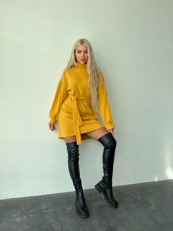 Модель 5371kat Жіноча сукня Розмірний ряд 42-44;46-48 Тканина двустороння Ангора Кольори сірий, чорний, бежевий, пудра та жовтий Сукня вільного покрою, з довгими рукавами, з горлишком, з пояском