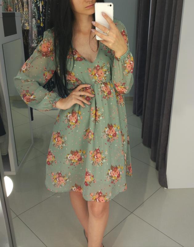 Короткое шифоновое платье в цветочный принт имеет V-образный вырез, свободный длинный рукав на резинке. Размер: M