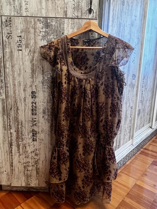 Літнє плаття квіткового принту з цікавими деталями. На поясі невеличка жатка, що візуально звужує талію, а декольте красиво прикрашене ажуром