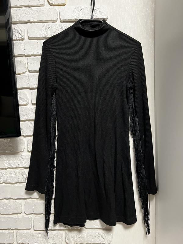 Платье трикотажное в рубчик.На рукавах бахрома.Длина 80 Рукав 60 ПОГ 36 ПОБ 44 Тянется хорошо.Подойдет на размер S M