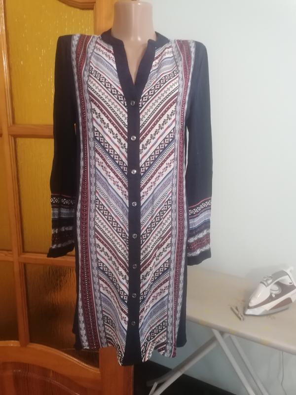 Состояние отлично. Не тянется. 100 %вискоза. Длина спереди 80, сзади 88, пог 45, поб до 50, рукав 59. Цвет темно синий. Укрпошта або Нова пошта.