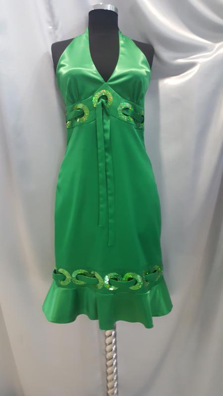 Вечернее короткое платье в сдержаном стиле, приталинное , ткань атлас немного стрейч , цвет насыщенная яркая зелень , спина полуоткрытая ( бюстгалтер помещается) , длина 100 см , декорировано паетками ( паетки пришивные). Объем груди 88 см ; объем под грудью 76 см , объем бедра 98 см .