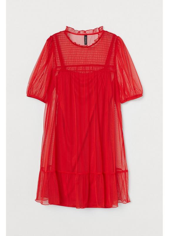 Короткое прямое платье с круглым вырезом и небольшим воротником с рюшами, присборенная кокеткой спереди и короткими рукавами-фонариками на узкой резинке. Юбка со швом выше подола. Обметанные края вокруг воротника и Подола.
