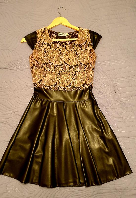 Бомбезна, ефектна сукня в стані нової (вдягалась 1 раз на корпоратив). Тканина - м'якенька еко-шкіра в поєднанні з гіпюром. Розмір S. Довжина по спинці 85см. ПОГ 44см. ПОТ 36см. Дуже багато суконь, запитуйте.