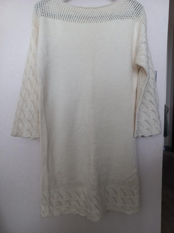 Платье ручной работы молочного цвета (ручная вязка). Приспущене плече. Длина 88 см. Ширина 46×2 см., от рукава до рукава 54 см. Длина рукава 45 см.