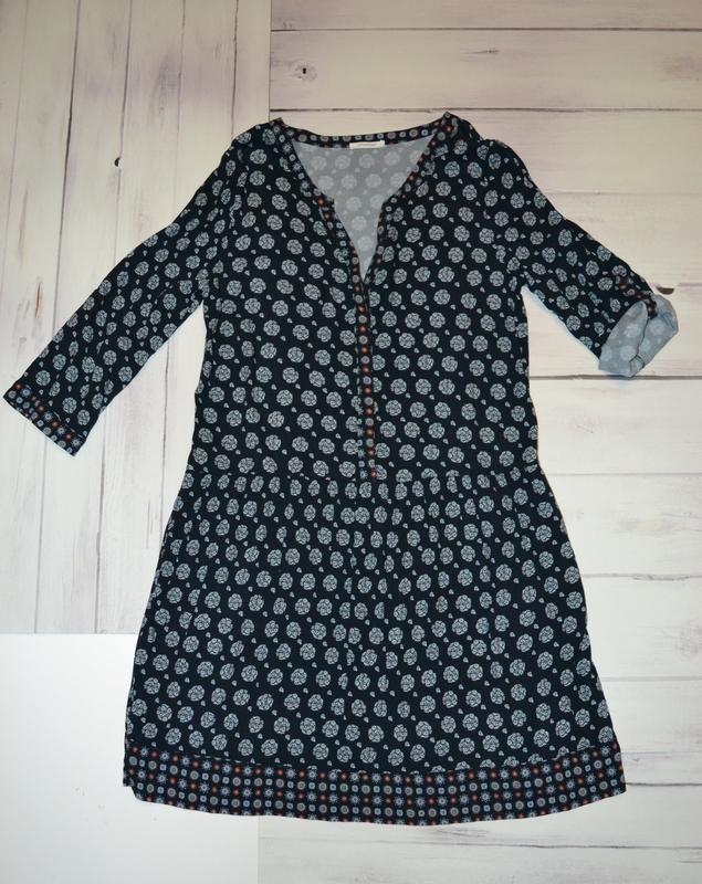 Обязательная вещь в Вашем летнем гардеробе!Цвет темно синий,принт в белые букетики,не просвечивается.Качество обалденное -ткань 100 % вискоза,рукава регулируются хлястиком,перед до пояска на пуговчиках скрытых под планкой,отрезная талия,прорезные карманы.Можно носить как платье или как тунику,состояние идеальное,куплено в стоке и одето один раз-мой обидный пролет в размере(Мне кажется, что оно маломерит до 14 размера,смотрите замеры- ПОГ 48 см ПОТ 45 см рукав от плеча 44 см длина 93 см бедра макисмум 54 см,не должно быть впрытык,свободнее красивее)