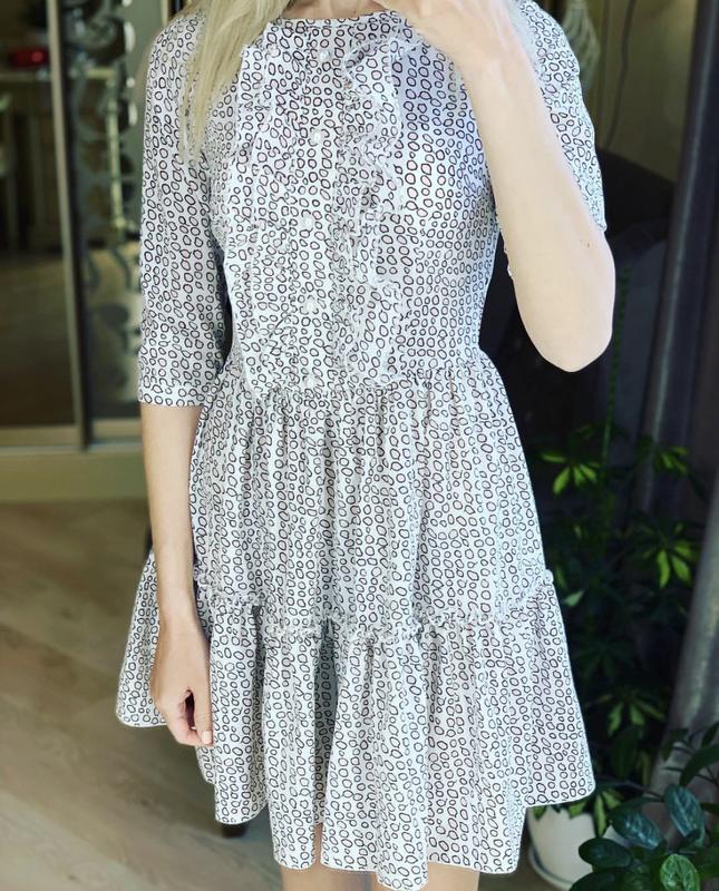 Хорошее нарядное платье с интересным принтом, в размере S подойдет для любого события. Платье идет с поясом, оснащено жемчужинками, рукав 3/4