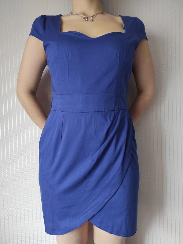Платье мини синего цвета с частично открытой спинкой. Размер 14, наш 50-52. Длина 90, длина рукавчика 10, плечи 40-41, ПОГ 50-51, ПИТ 41-42, ПОБОДЫ 50-53, низ 55-60. Стан идеален!