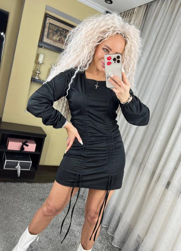 ♟♟♟Новинки♟♟♟ Платье мини однотонное на затяжках •Окраска: черный, беж •Размеры м 42/44(2) и л 44/46 (3) Длина 82 (можно регулировать) Рукав 65 М (2) пог 42+ Л (3) пог 45+