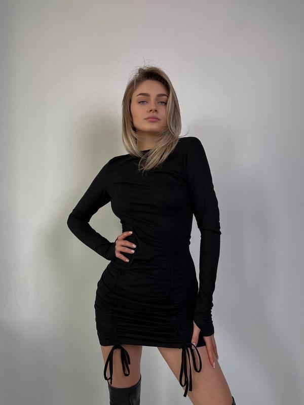 🔘Артикул: R4940/13653 🔘Тканина: еко-замша 🔘Розмір: S, M, L 🔘Колір: чорний, зелений, коричневий Облягаюча сукня еко-замші з симетричними вертикальними кулісками. Модель міні довжини з довгими рукавами.Горловина закритої форми, на спинці блискавка.