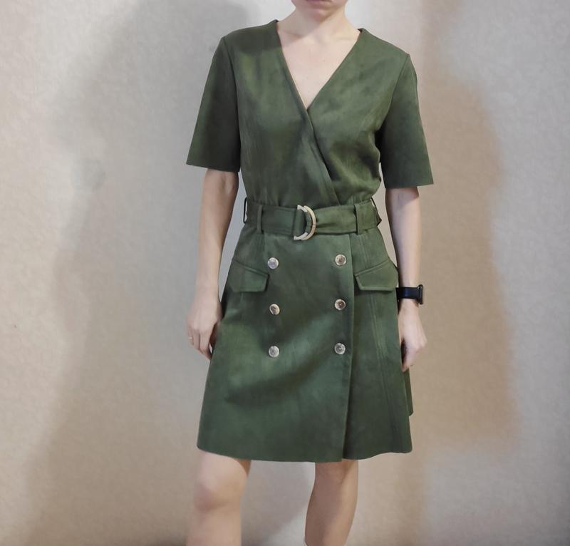 Платье в отличном состоянии, размер на бирке М, на 44-46. Было одето пару раз. Модель - на запах. Ткань - имитация замши. Одягнуто на рост 160. Замеры следующие: ПОГ 45 ПОТ 39 ПОБ 50 рукав 25 Длина платья 86