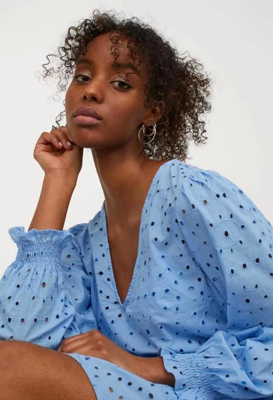 Коротка широка сукня з бавовняної тканини з вишивкою рішельє. Трикутний виріз горловини і широкі рукави з вузькою гумкою на зап'ястях і воланом по низу. прискорений шов на талії і спідниці. Спіднє плаття з трикутним вирізом і регульованими вузькими бретельками 100% бавовна, підкладка: поліестр. Розмір за бірочкою 36, за рахунок вільного крою підійде на більший розмір. Заміри верхньої сукні: Напівобхват грудей 52 Стегна- вільні Довжина 87 Рукав 62 Заміри підкладочної комбінації: Напівобхват грудей 45 в стані спокою, тканина еластична, добре тягнеться. Вимірювання на міцність я не проводила, але до 52 тягнеться спокійно ))) Напівобхват стегон 52 в стані спокою, тягнеться сантиметрів на 10 більше. Нова, без паперової бірочки, аутлет, залишився навіть пластиковий тримач.
