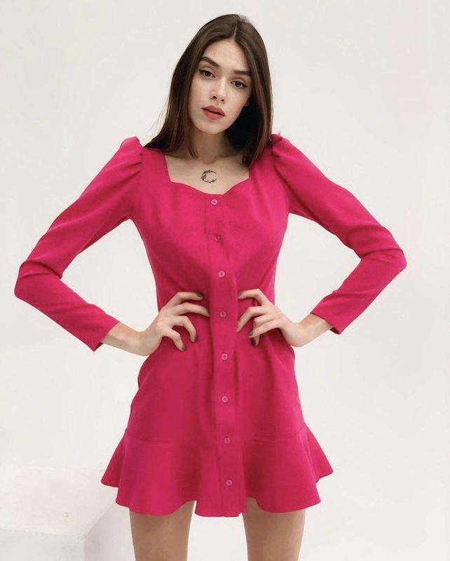 Сукня рожева Дуже стильний крій Ґудзики повністю розстібаються Тканина цупка , не просвічує Розмір s (буде добре і на м)