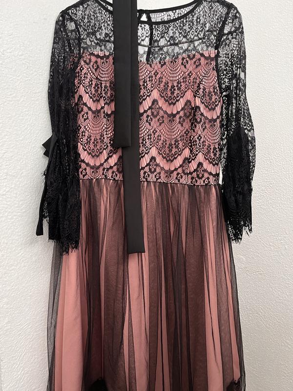 Розовое платье с черным гепюром. Имеет потайную застежку на спинке, рукава 3/4, фатиновая юбочка целая, но имеет на плече дефект (разишел гепюр, фото есть). Одягалось 1 раз. Торг возможен