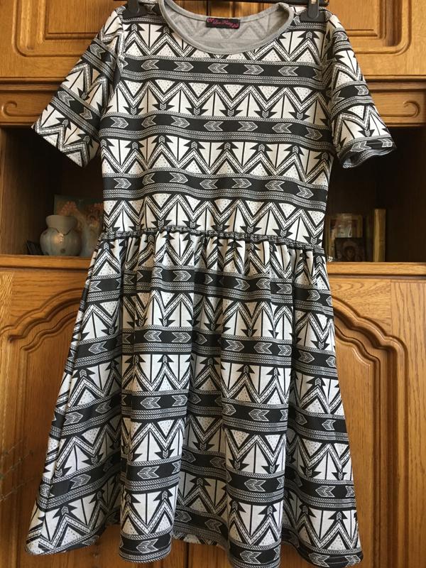 Плаття в геометричний принт.Довжина 85,рукав 22 см,пог 43 тягнеться до 50,талія 45 тягнеться на резині до 60.бірка зрізана йде на М Л