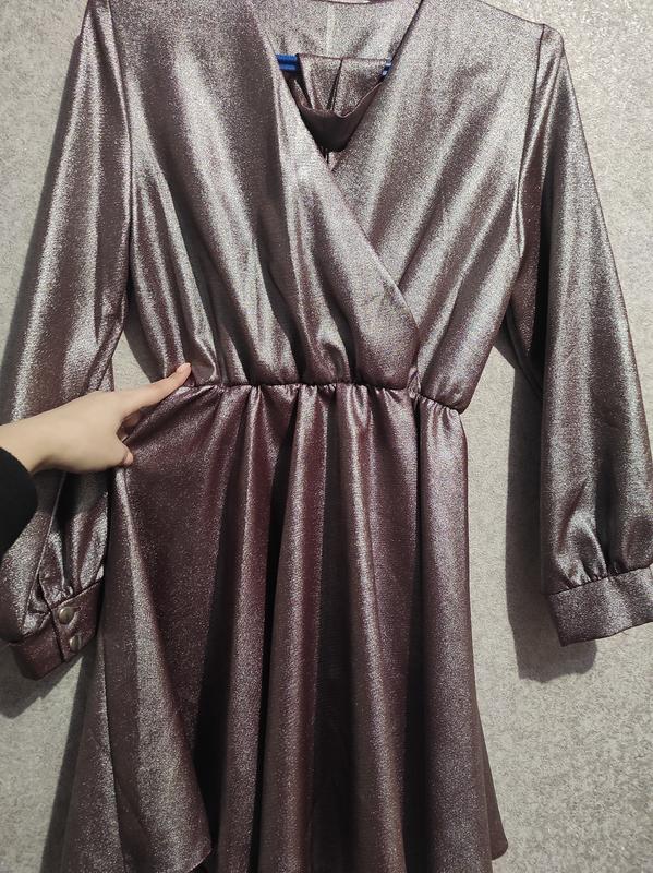 Мини платье, цвет под металл, внутри бордо. По виду как на запах, есть пояс, низ пышный