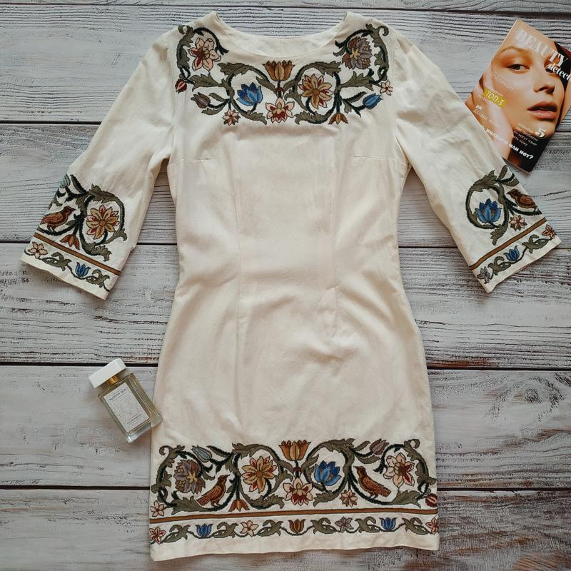 Невероятное вышитое платье из натуральной ткани. Платье сшито по заказу. Вышивка - полностью ручная работа (счетных крестик). Сбоку есть потайная молния. Рукав 3/4. Наделась дважды. Размер S Длина 83см Плечи 38см Рукав от плечевого шва 43см Ног 44см Нот 35см Ноб 46см